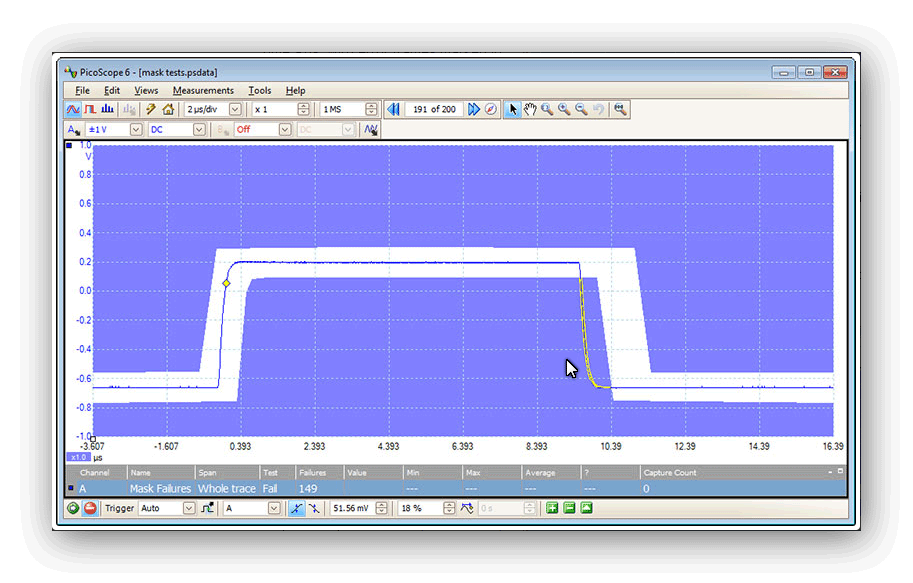 Mask limit testing allows you to compare live signals against known good signals, and is designed for production and debugging environments. Simply capture a known good signal, draw a mask around it, and then attach the system under test. PicoScope will capture any intermittent glitches and can show a failure count and other statistics in the Measurements window.