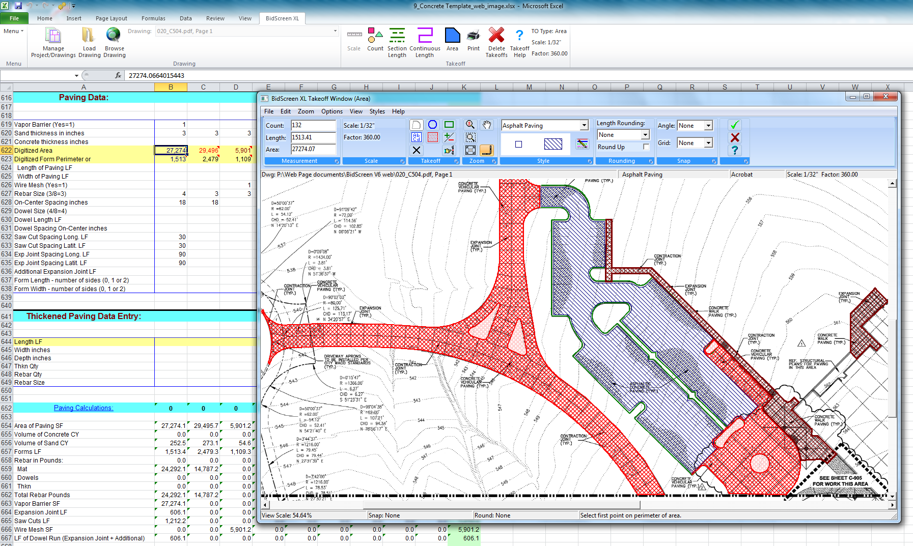 Once the measurement is obtained on-screen, the on-screen digitizing software or Excel should automatically and easily provide further calculation capability to arrive at the quantities.